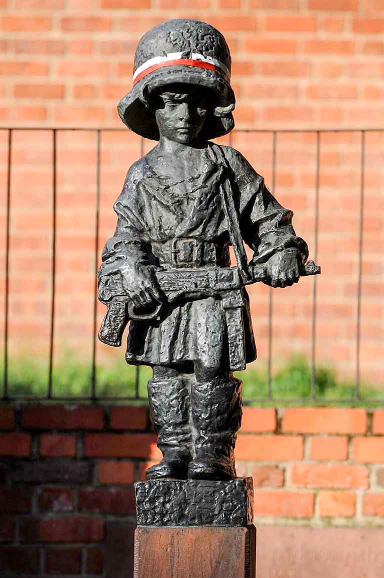 The bronze sculpture depicts a young boy wearing a large German Stahlhelm (insurgents wore helmets captured from the Germans), with an eagle and a painted red and white armband. He is wearing oversized boots and a camouflage fatigues (or coat), with a submachine gun (rifle) slung over his shoulder.