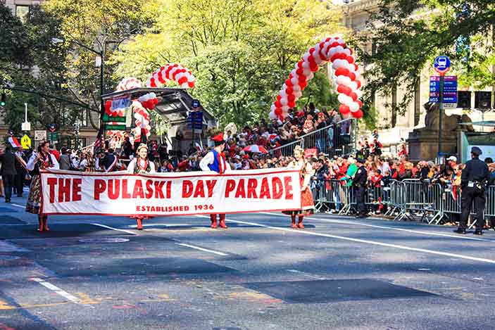 Pulaski Parade, New York City - an annual, major event held on Fifth Avenue in New York City in honor of Casimir Pulaski; held on the first Sunday of October every year since 1937. (Source: Wikipedia)