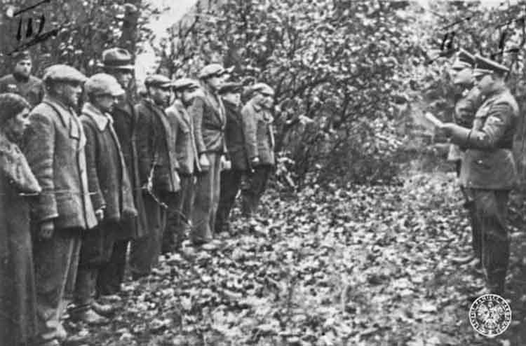 Szubin, October 21, 1939. Just before the execution. Two SS officers (one of them SS-Sturmbannführer Ernest Tiedemann) read the death sentence to a group of Poles (Source: Institute of NAtional Remembrance archives)