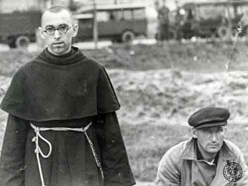 Gdynia, September 14, 1939. Two residents interned by the Germans, shortly after the occupation of the city, are waiting for questioning in the square on Świętojańska Street. On the left stands a monk from Niepokalanów dressed in a dark robe: Brother Kornel - Władysław Kaczmarek (Source: Institute of National Remembrance archives)