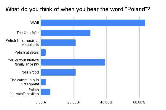 When asked what came to mind when they hear the word “Poland”, 60% of respondents selected World War II, and nearly a third chose the Cold War. Fill-in-the blank responses centered around cuisine and personal associations, whether via friends or family members.